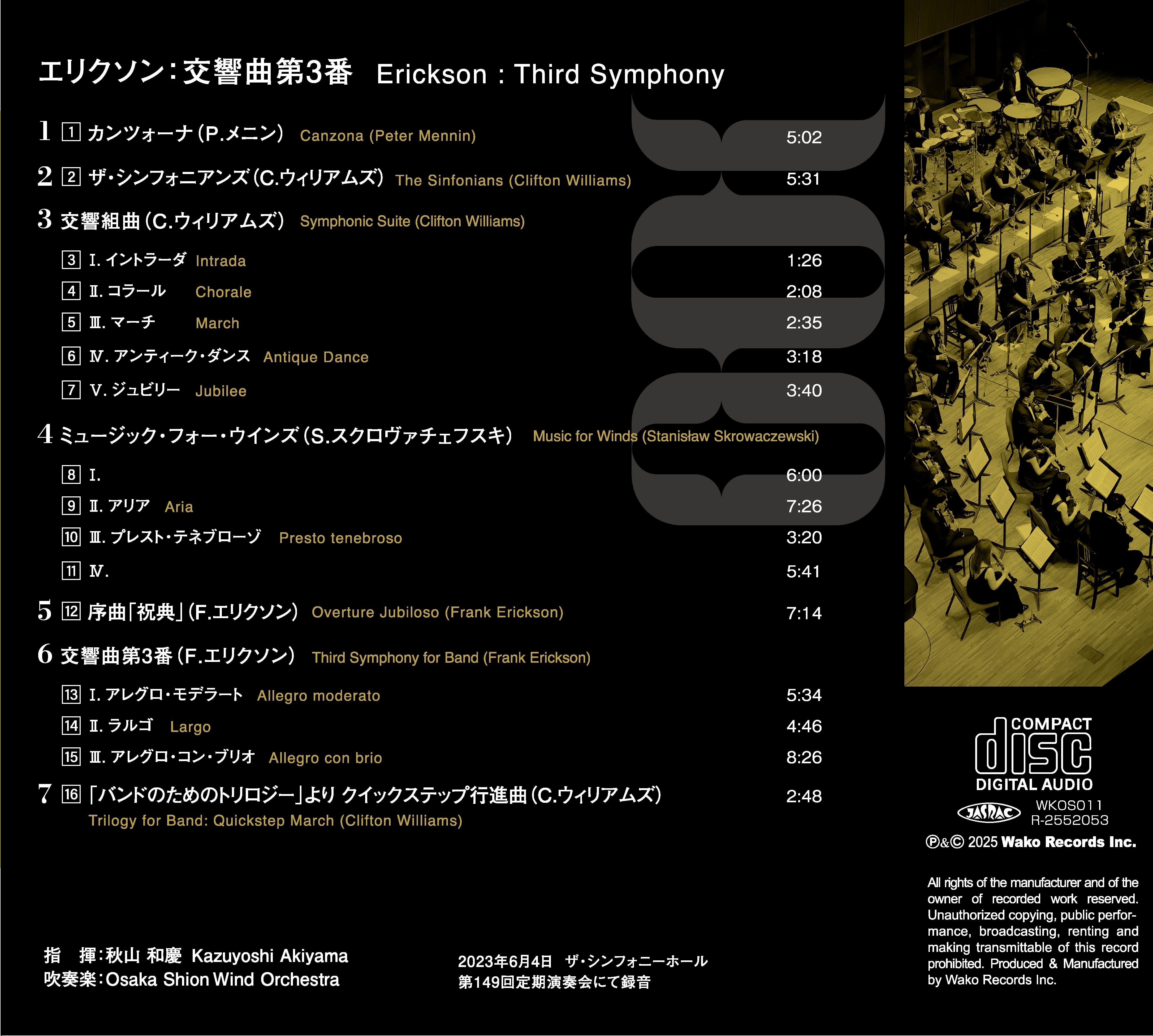 エリクソン:交響曲第3番 Erickson: Third Symphony/Osaka Shion Wind Orchestra (WKOS-011)